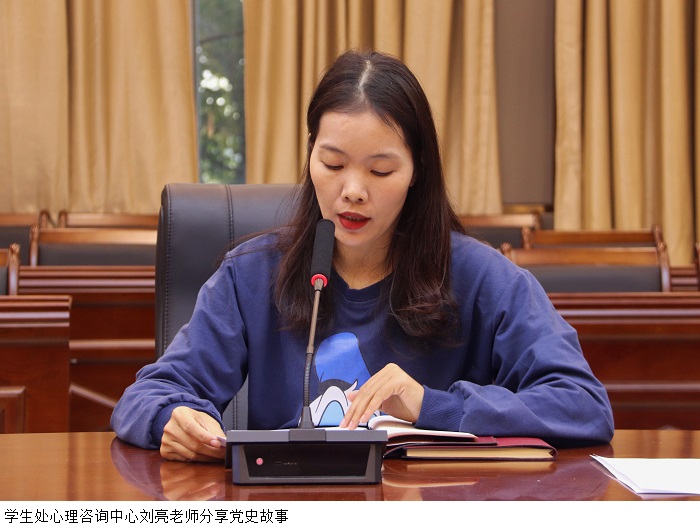 学生处心理咨询中心刘亮老师“聆听党史故事,传承革命精神”为主题,分享了革命先烈张太雷“寻找我们将来永远的幸福”的故事。刘亮老师表示,张太雷把自己年轻的生命无私奉献给中华民族的解放事业,他的崇高品格和革命精神,永远值得我们学习和怀念。