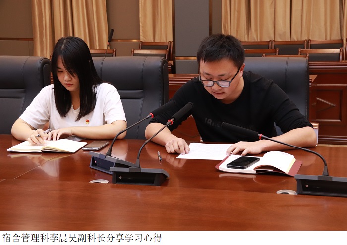 随后,学生处宿舍管理科副科长李晨昊、奖助贷科谭秋键老师结合岗位工作分享了自己的心得体会。李晨昊表示,要将党史学习教育融入立德树人根本任务中,传承红色基因,培养极具坚定理想信念的应用型人才。
