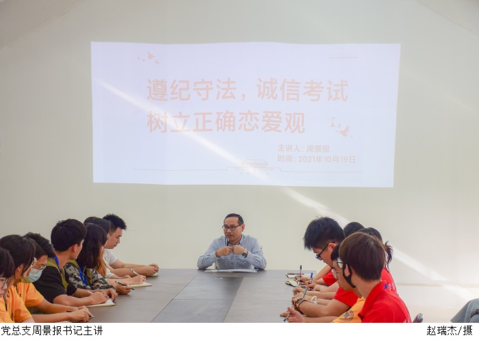 本网讯(建设学院易班学生工作站)实立德树人根本任务,结合近期开展的普法修德守纪专题教育活动,进一步推进建设学院学风建设增强学生遵纪守法意识,加强学生诚信意识、帮助学生树立正确的恋爱观,建设学院于10月19日下午在3栋5楼会议室开展了遵纪守法,诚信考试,树立正确的恋爱观专题讲座。建设学院党总支书记周景报主讲,各组织干部及学生负责人参加