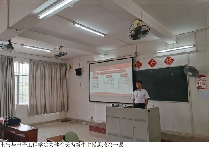 本网讯(电气与电子工程学院 叶运黎)为进一步落实立德树人根本任务,教育引导2021级新生感党恩、跟党走,坚定“四个自信”,做到“两个维护”。9月15日、16日,电气与电子工程学院关健院长、党总支陈文华书记为我院2021级新生讲授思政第一课。