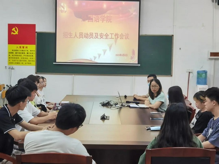 为保证宣传工作顺利进行,外国语学院党总支吕丽红书记于6月4日下午在37栋37101召开招生宣传动员及安全工作会议。吕书记强调,此次招生活动一切要以安全第一,有组织有纪律地去各个学校进行招生宣传,为学校扩大生源,为各地高考考生助力加油。