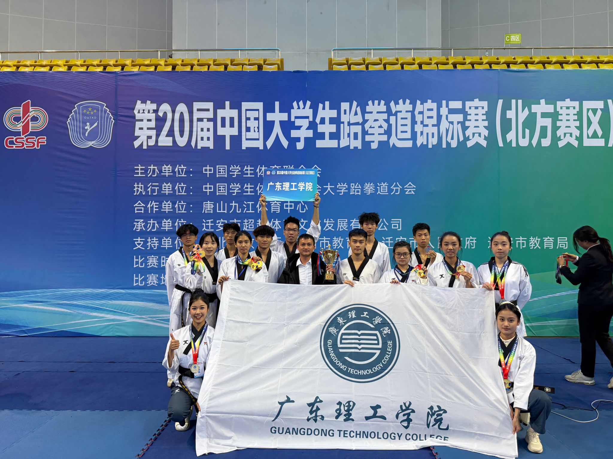 本网讯(体育学院)青春激扬展风采,跆拳健儿竞锋芒。第20届中国大学生跆拳道锦标赛(北方赛区)于11月16日在迁安市唐山九江体育中心圆满落幕。本届赛事规模与专业水准再创新高,汇聚了来自全国169所高校的1700余名运动员、教练员与领队参赛。bat365官网跆拳道队派出14名运动员参赛,在体育学院书记杨波副院长以及教练员彭志刚的带领下,队员们经过四天的激烈角逐,最终斩获5金、4银、3铜牌与4项第五名、甲组男子团体总分第三的佳绩。