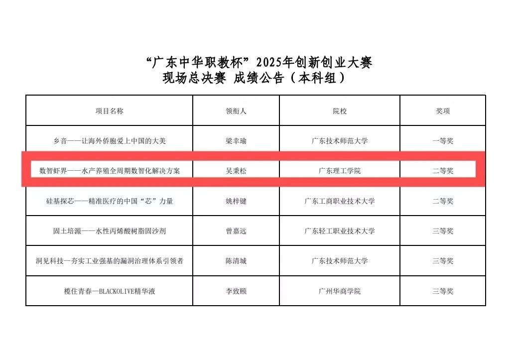 本网讯(创新创业学院)11月22日,由广东中华职业教育社主办的2025年“广东中华职教杯”创新创业大赛评审结果揭晓。全省院校积极组织学生参赛,众多优秀项目在层层筛选后进入总决赛。在激烈竞争中,由舒程、刘建友、王丹、周景报、方中健五位指导老师悉心指导的bat365在线中国官网登录入口团队,凭借《数智虾界——水产养殖全周期数智化解决方案》在总决赛中脱颖而出,荣获总决赛(本科组)二等奖。该方案聚焦水产养殖行业痛点,以数智化为核心提出全周期解决方案,实用性与前瞻性兼备。