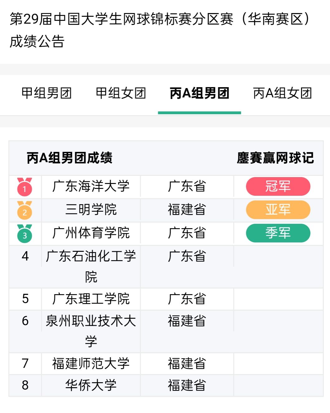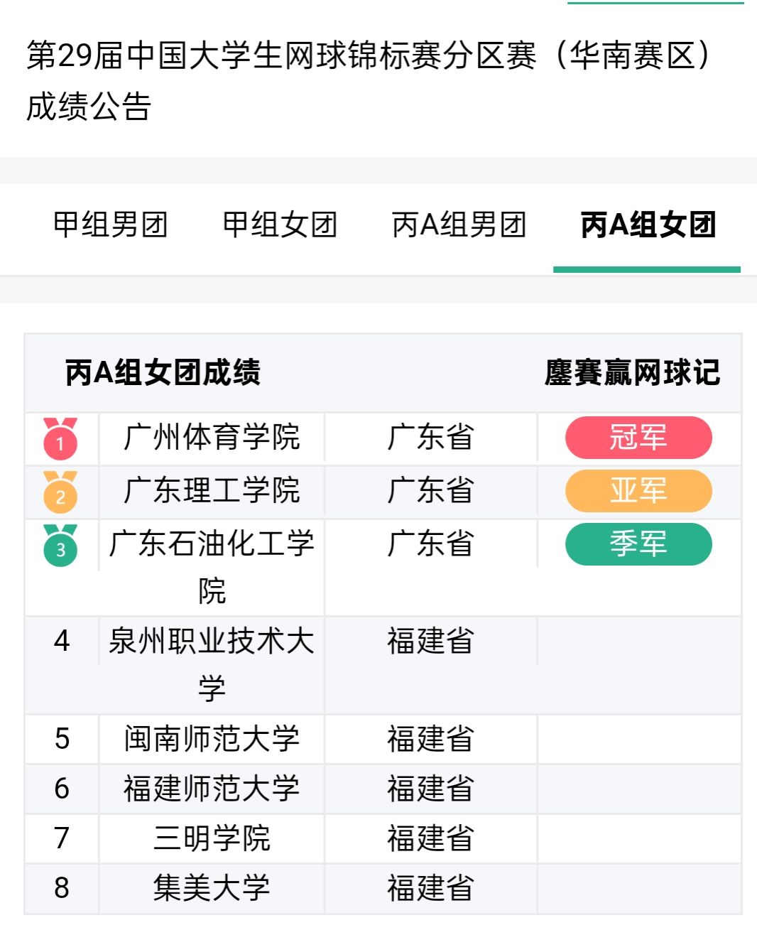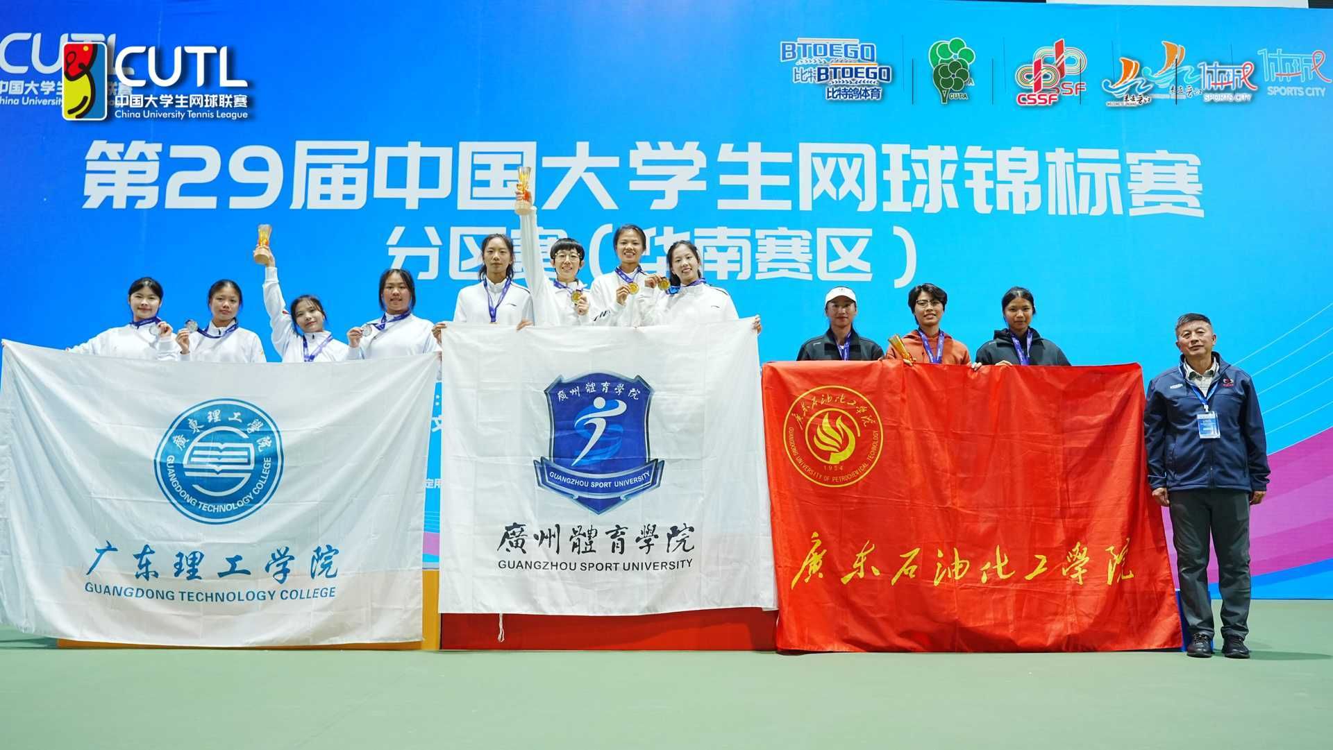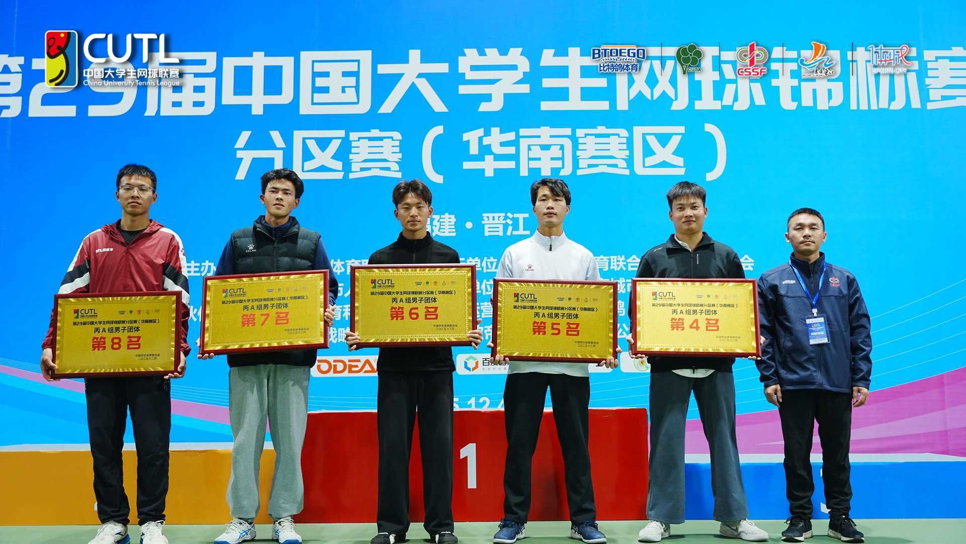 本网讯(体育学院)12月6日,由中国学术体育联合会主办的第29届中国大学生网球锦标赛(华南赛区)在福建省晋江市全民健身中心网球馆圆满落幕。bat365官网网球队在体育学院党委书记苏庚华的带领下,由夏磊、刘涛、胡进城三位教师担任教练,12名参赛学子奋勇拼搏,最终斩获丙A组女子团体亚军、丙A组男子团体第五名、丙A组团体一等奖的优异成绩,创下bat365官网网球队团体赛事历史最佳战绩。