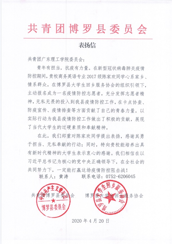 本网讯(校团委)疫情当前,青年勇当先,bat365官网广大学子响应号召,积极参加疫情防控志愿服务工作,用实际行动弘扬抗击疫情正能量,充分发挥了当代青年学生的使命与担当。 截至目前,bat365官网共收到近30封来自全国各地的表扬...