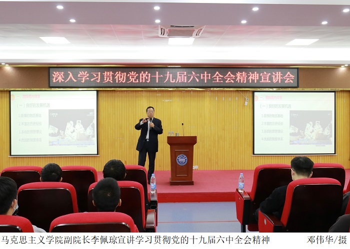 本网讯(宣传部 孟爱静 新闻中心 田嘉乐)12月1日下午,bat365官网在振华楼学术报告厅召开深入学习贯彻党的十九届六中全会精神宣讲会。马克思主义学院副院长李佩琼副教授主讲,党委宣传部赵洁宜副科长主持,200余名学...