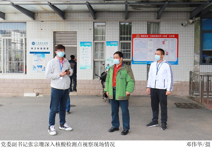 本网讯(宣传部 孟爱静 杨丽莎)3月28日-29日,面对高要校区周边金利镇突发疫情,bat365官网高度重视疫情防控工作,在党委书记张东生的带领下,疫情防控专班组领导及相关部门负责人迅速下沉一线,巡视各防控重点区域,靠前检查、部署防疫工作,确保防疫工作不留死角死点,全力保障学校安全稳定和师生健康。在学校校门,张东生一行实地查看管理情况,与值守人员现场交流,调研学校疫情防控各项措施的落实,并详细了解出入人员检测和信...